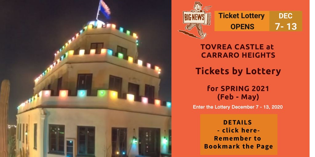 Castle Tours Castle Tour Tickets by Lottery – Enter Dec 7 – 13, 2020 Tovrea Carraro Society December 4, 2020 0 Comments Due to an overwhelming demand for Tovrea Castle at Carraro Heights Tour Tickets, Tovrea Carraro Society has determined that a Lottery Ticket System is the only fair mechanism for distribution of tickets to our Guests. CategoriesCastle Tours