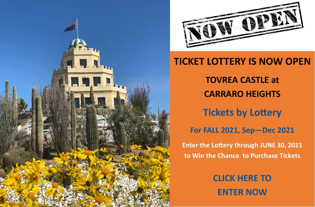Castle Tours Ticket Lottery Now OPEN for Regular Tour Tickets for Tovrea Castle at Carraro Heights Tovrea Carraro Society May 26, 2021 0 Comments CategoriesCastle ToursTags#historic, #tickets, #tovreacastle